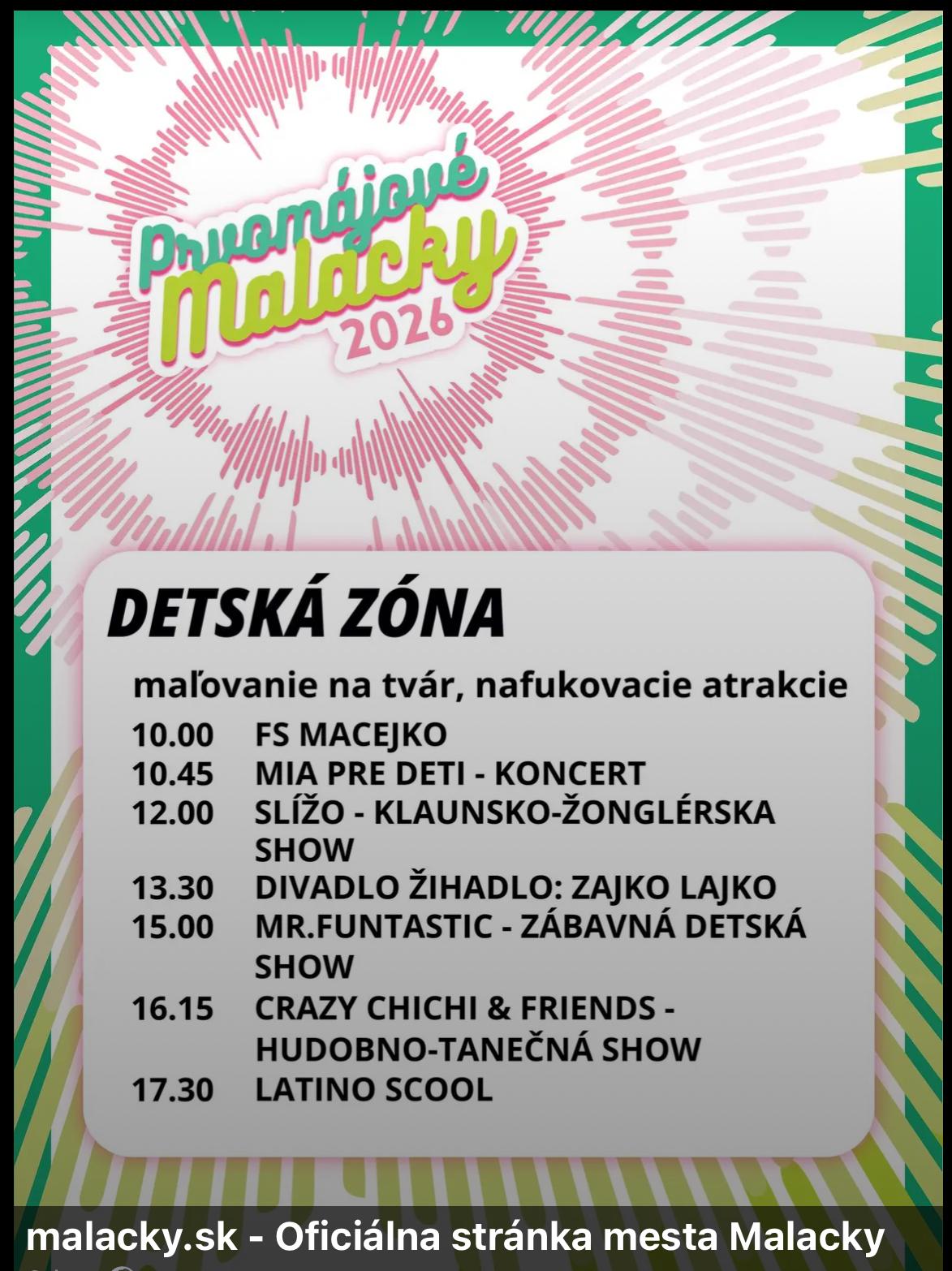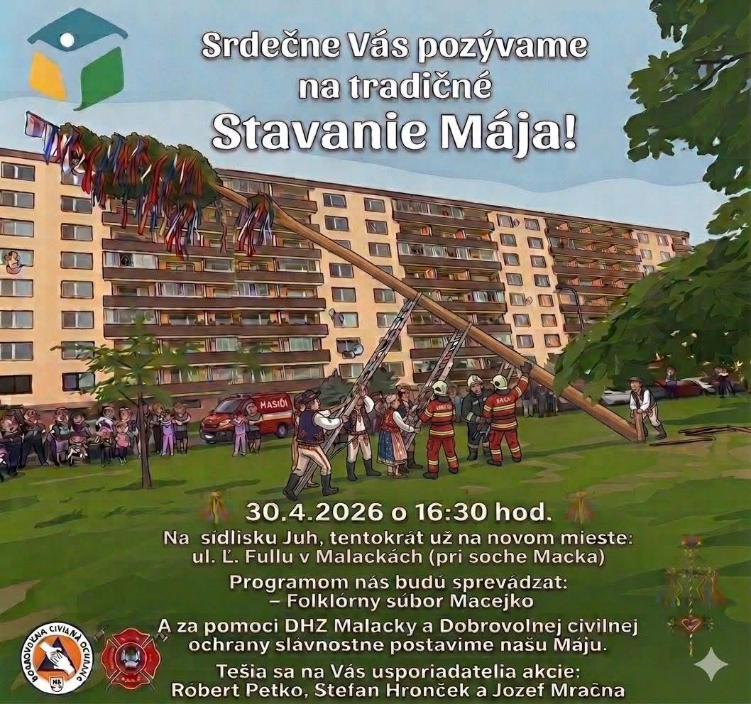 Srdečne Vás pozývame na tradičné Stavanie Mája! Na sídlisku Juh, tentokrát už na novom mieste: ul. Ľ. Fullu v Malackách (pri soche Macka) Programom nás budú sprevádzat: - Folklórny súbor Macejko A za pomoci DHZ Malacky a Dobrovolnej civilnej ochrany slávnostne postavime našu Máju. Tešia sa na Vás usporiadatelia akcie: Róbert Petko, Stefan Hronček a […]